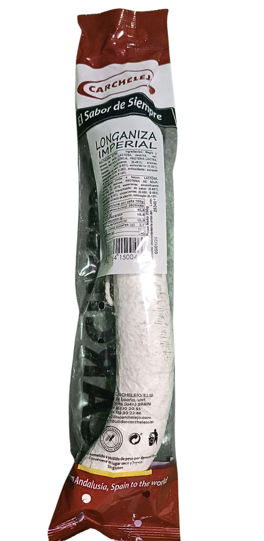 La Longaniza Imperial Sin Gluten Carchelejo es un embutido artesanal que combina tradición, sabor intenso y seguridad alimentaria. Elaborada con carne de cerdo seleccionada y especias naturales, ofrece un aroma profundo, textura firme y jugosa, y un sabor equilibrado con el carácter clásico de la charcutería española.