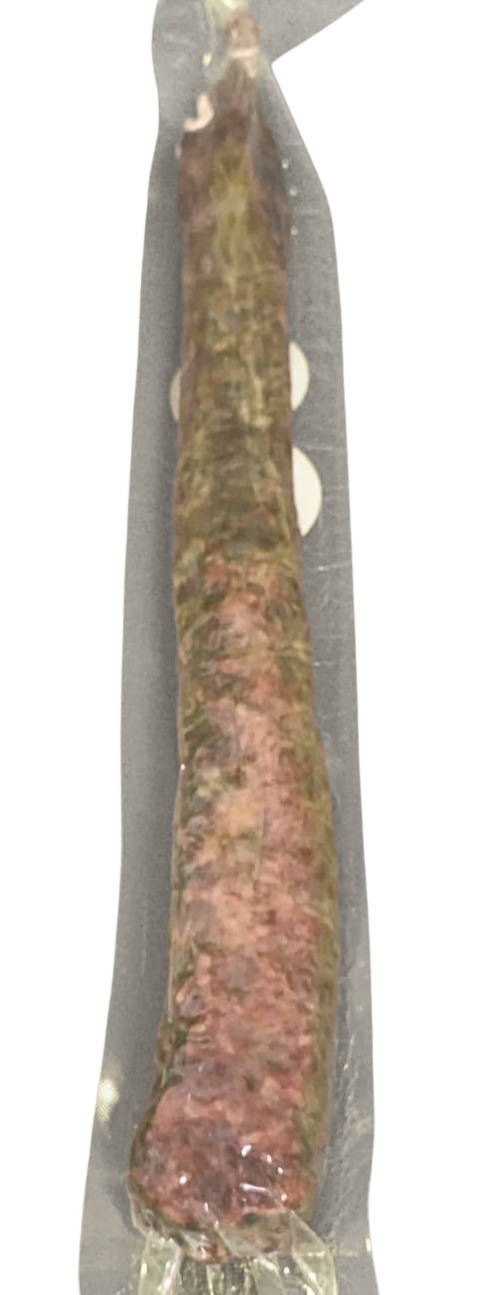 Este salchichón destaca por su adobo artesanal con sal, ajo y pimienta, que le confiere un perfil gustativo auténtico y persistente. Su presentación en tripa natural cular y su curación sin aceleradores garantizan una experiencia gastronómica de calidad superior.