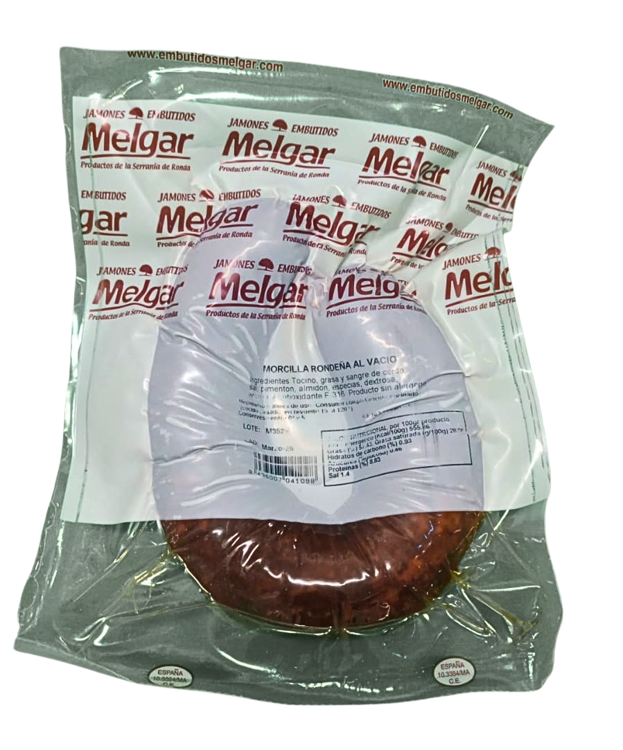 La Morcilla Rondeña al Vacío Melgar es un embutido tradicional elaborado artesanalmente con ingredientes seleccionados: sangre de cerdo, arroz, cebolla y especias naturales. Su receta, típica de la comarca de Ronda, ofrece un sabor auténtico, equilibrado y delicadamente especiado que refleja la tradición de la charcutería andaluza.
