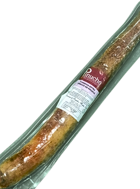 El Chorizo Ibérico de Bellota Pinucho es un embutido artesanal de primera calidad, elaborado con magros seleccionados de cerdos ibéricos criados en libertad y alimentados con bellotas durante la montanera. Su adobo con pimentón, ajo y especias naturales, junto con una curación lenta en secaderos tradicionales, le proporciona un sabor intenso, aroma profundo y una textura firme y jugosa que lo convierte en un auténtico producto gourmet.